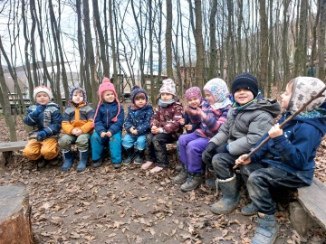 Místo na sněhu jsme se klouzali hlínou a listím - roklí to dolů taky dost jede! Putovali jsme do kopců i z kopců, zdolávali těžký terén, běhali mezi kapkami deště, pozorovali, jak tančí listy ve fujavici. Z lesa nosíme smrkové větvičky na vánoční výzdobu. Vijeme věnce a věnečky. Z dřívek nám pod rukama vznikají stromečky, domečky, hvězdičky, ozdobičky... Užíváme si i dopoledne v jurtě, kam nás zahnal déšť. Tiskneme zvířecí stopy, pozorujeme, jaké jsou mezi nimi rozdíly a komu které patří. Louskáme oříšky, krájíme jablka i mrkve. S nadílkou vyrážíme ke krmítkům v lese - potřebují opravu, příště s sebou vezmeme i kladívko a pár hřebíčků.