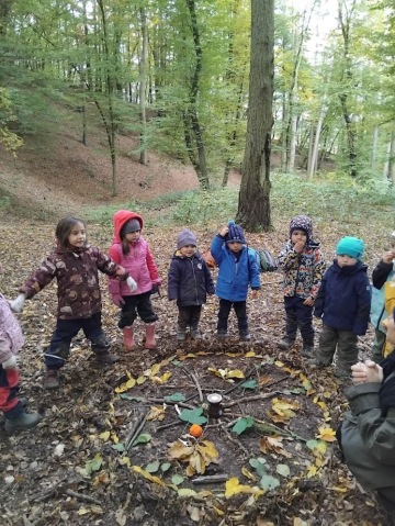 Putujeme rozmanitým terénem - rovinami, dolinami i kopci. Trávíme čas v lese, kde stavíme skřítčí domečky i mandalky z listí, zkoumáme dutiny stromů, lozíme po kořenech, tvoříme z mechu. Na kopci máme překrásné výhledy a sluníčko v tváři. Na louku si bereme míč, házíme, chytáme, kutálíme, posíláme, hrajeme hry. Domů jdeme jako dlouhý had - držíce se lana. Prostor dostává volná hra, které je nám dětem tolik třeba.