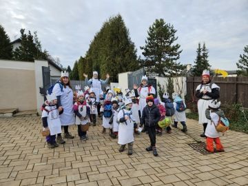 Co by to bylo za mušketýry, kdyby byli jen tři? Se třemi králi je to podobné. Legenda praví, že král Artaban šel touž cestou jako tři mudrci z Východu, ale asi že byl milosrdnější, zdržela ho pomoc bližním a potřebným. Takové pomoci není nikdy dost a Artabanovo zdržení se zvětšilo na celý Kristův život. Životy našich dvorečků jsou na začátku, ale na poli pomoci bližním už mají nacvičeno. V bílém brnění a pod korunami dobývali srdce a dlaně potkávaných. Hlásky našich zpěváčků vyzpívali pěkných pár korunek do zapečetěných kasiček. Sypeme božskému ptactvu na krmítko.