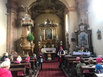 Ta vůně tlejícího listí, když hrabeme cestičky mezi habry! Dušičkový čas, vzpomínání na prababičky a pradědečky. Nebo na morčátka, králíčky, pejsky a kočičky. Teplý podzim nám vtiskne své barvy do očí, lošké listí setřásáme z dubů. Válíme sudy zkopečka, zápasíme ve stylu sumo. Schováváme se v listí, chytáme padající lístek ze vzduchu! Vyrábíme sovičky z kaštanů, zdobíme a uklízíme bunkr. Navštěvujeme vzácný kostel sv. Mořice. Hrajeme na bejka a na obra mezi trpaslíky. Balancujeme na rozličných překážkách na lesním hřišti. Dupeme výletem po Burešovce a hrajeme na kanálníka. Měříme si odborně oči. Pleteme si dušičkové věnečky. Čteme si o vlacích a kreslíme je. Krájíme a sušíme pomeranče. přetahujeme se lanem, které se pak mění v překážkovou dráhu. Vyrábíme hudební nástroje - drhla.
