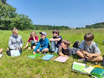 V uplynulých týdnech jsme se věnovali přírodě z různých úhlů – pozorovali jsme obojživelníky s odborníkem a na škole v přírodě tvořili vlastní herbář. Tentokrát jsme se vydali přímo na louku, kde jsme při venkovní výuce pozorovali a „poslouchali“ přírodu všemi smysly. Svá pozorování jsme zaznamenávali a společně z nich vyvozovali závěry. Přemýšleli jsme nad tím, co roste a žije v různých vrstvách louky, proč právě tam, co různé druhy ke svému životu potřebují a jak si navzájem pomáhají. Dostali jsme se i k tématům jako je rozdělení přírody na živou a neživou složku nebo společné znaky rostlin a živočichů. Ve třídě jsme v matematice pokračovali v práci s kružítkem, rýsovali jsme kružnice, nově se naučili rozlišovat kruh od kružnice a zkoumali jejich průsečíky. V českém jazyce jsme trénovali časování sloves a připravovali si prezentace svých přečtených knih. V hudební výchově jsme pak spojili síly a s chutí a kreativitou sobě vlastní jsme zhudebnili báseň. Při angličtině už sice také máme červen, ale ještě se nám daří procvičovat všechno možné. Zopakovali jsme slovní zásobu k tématu zvířata, dávali si hádanky pomocí vět jako It is, It has got, It lives, It eats a nakonec jsme se podívali na kus dokumentu o domácích mazlíčcích.
