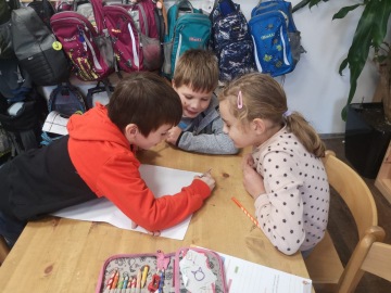 Při angličtině jsme se zaměřili hlavně na čtení a psaní barev a věcí ve třídě. Pilujeme, co to jde! Učíme se číst a psát: yellow, red, orange, blue, green, pink, a table, a chair, a teacher, a pen, a pencil, a book. Zahráli jsme si hudební židlovanou, hru ve dvojicích v učebnici a stihli jsme i přečíst kapitolu z knížky Drak Balabán, jako jinak než česko-anglicky :)