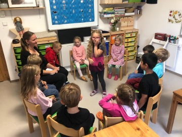 spolupracovali, hráli nejrůznější hry a vše jim šlo báječně. Dokonce si domů odnesli i první domácí úkol. Vypadalo to, že bez něj snad ani neodejdou domů. Také si užili anglickou středu. V anglickém jazyce se Ledňáčci seznámili s hlavními postavami učebnice Happy house. Každý Ledňáček se představil v angličtině. Zahráli si hry s barvami - hledali venku přírodniny. Seznámili se s několika zvířátky - cat, dog, tiger and giraffe.