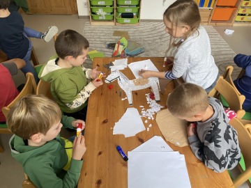 Další týden utekl jako voda a my už se připravujeme na svatomartinskou slavnost. Takže jsme se kromě učení věnovali výrobě lucerničky a povídali jsme si o dobrých skutcích a milosrdenství, převyprávěli jsme si příběh o Martinovi. V matematice si hrajeme s mincemi, vymýšlíme nejrůznější kombinace, kterými lze zaplatit zboží, lovíme ryby s příklady a hádáme myšlená čísla. V češtině začínáme číst jednoduchá vyprávění, něco málo už dokážeme i napsat, zatím jen velkým hůlkovým písmem. Při nácviku psaní se nám daří dosahovat větší přesnosti tvarů. A co by to bylo za týden, kdybychom si nezazpívali?