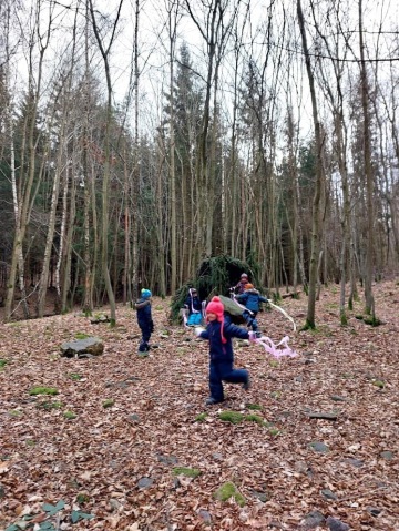 Při našich toulkách lesem stavíme velká i malá hnízda z různých přírodních materiálů, zkoušíme létat, připevňujeme si perutě z krepového papíru - ach ty krásně vlají ve větru. Zpíváme písničky ptačím jazykem (píp píp, čimčarara čim, húúú, krá krá, vrků...), hrajeme ptačí honičku i hru na datla. Vydáváme se také na veliký výlet do PTAČÍ ŘÍŠE na nová neprozkoumaná místa. Fantazírujeme, sbíráme peříčka, užíváme krásu tichého klidného lesa, kde jen občas zazní hlasy ptáčků...