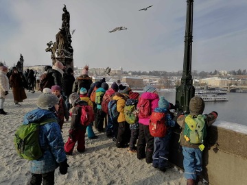 Vlaky jezdí, i když mrzne. Cestovatelské štěstí nám přeje. Ocitáme se pod sochou amerického prezidenta Wilsona - u jakého nádraží? Zasněžená Praha je kouzelná. Okrové odstíny zdiva s měděnkou a sněhem v dopoledním slunci. Adventní sen! Ve snu se odehrává většina divadelního příběhu ve Skautském institutu. Duch budoucích Vánoc konečně obměkčil Žgrlošovo srdce a Vánoční koleda mohla skončit. Hrály a zpívaly nám starší děti pod vedením paní režisérky Deákové. Srdečné osoby, která nás vřele přivítala a na rozloučenou nám dovolila si posbírat pár lesklých rekvizit. I naobědvat jsme se mohli pod teplým trámovým stropem divadla. Procházkou jsme prokličkovali mezi turisty na Královské cestě, objevovali jsme sochy na Karlově mostě. Navštívili jsme svaté Jezulátko, má zrovna fialový obleček. Tramvají na nádraží a dalším kolejovým vozidlem na Řevnice.
