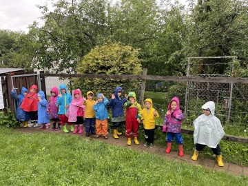 Slavíme narozeniny, pojídáme mufiny. Vozíme krajinky do dřevníku. Počítáme piliny. Tančíme na juke-box Anežka. Putujeme lesem do kopců i do strání. Potkáváme žáby, houby i zralé borůvky. Kutáme různobarevný jíl, pohřbíváme mrtvé chrobáky, malujeme na kamínky, vyřezáváme hůlky. Hrajeme si na cyklisty vleže. Znáte to? Z kopce, do kopce, ufff, bacha! zatáčka.... Zpíváme písně známé i nové, tančíme tance nové i známé. Pod lípou se nám zabydlela kukléřka diviznová. Pozorujeme ji okem i lupou. Na divizně. Zatím má podobu housenky, brzy z ní bude noční můra a odletí. Z divizny moc nezbylo. Asi jí to ale odpoustíme. Hodně prostoru dostává volná hra, které je nám tolik třeba. Deště zažíváme na deset způsobů. Kapka sem a kapka tam. Průtrž mračen. Déšť, kterým proběhneme docela suší. Déšť, který umí zmáčet do poslední nitky. Déšť, který bubnuje do plachty jurty k usínání. Déšť, který se jen v dálce žene. Deštíček. Bouřka. Liják. Déšť zahradní. Žádný z nich nám nevadí. Máme pláštěnky, máme holinky. Napršela voda, máme jí plný sud. To se hned jinak řádí v pískovišti. Zahrádka roste bez zalévání. Máme vodu rádi, nejen v máji.