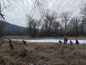 Mrzne jen to praští. Přidáváme další vrsvy oblečení, dvoje rukavice na sobě se hodí. Držíme se v pohybu. Probíháme slalomy a opičí dráhy, bavíme se pantomimou. Zamrzá všechno kolem - kaluže, voda v kyblíčcích, pískoviště... Jenom voda v řece je pořád divoká. A ani úsměvy nám nezamrzly. Tisíce krystalků jinovatky, ledové květy v oknech, galerie ledových obrázků. Křehkotvrdá pomíjivá krása. Led zkoumáme zblízka a i zdáli. Roztloukáme jej, malujeme, tvoříme diamanty... Vypravujeme se letos poprvé do Tůní. Zdoláváme náročný terén, prozkoumáváme nové místo, lozíme, šplháme, taháme, házíme, kloužeme se, volně si hrajeme, nasloucháme ptačím hlasům a dalším zvukům. Chodíme po tenkém ledě, ale nebojíme se, je vidět mělké dno. Hrajeme "Na mrazíka".