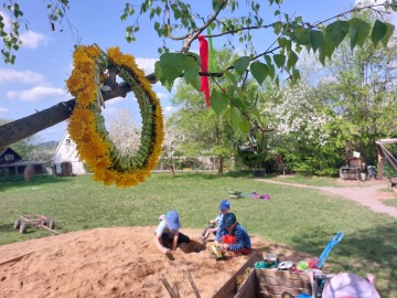 Na začátku týdne vyjíždíme vlakem do Černošic, kočkování a Original play pro předškoláky, pobytí na louce a na sluníčku pro malíčky. Pleteme věnce, zpíváme si do kroku na zpáteční cestě na Dvoreček. Na záhonech už jsou semínka v zemi, čekáme na úrodu mrkví, hrášku a ředkviček - kdo jako první vystrčí lístky z hlíny? V lese potkáváme pana Chrobáka, zachraňujeme ho z cesty, aby z něj nebyl pan Placka, jako z užovky, kterou nacházíme na cestě u řeky. Hledáme a nenacházíme mloky. Stavíme si domek ze soušek, pracujeme s noži a škrabkami. Hrajeme si s vodou a hrajeme si jen tak. A necháme si hrát -na kontrabas! Od Petra. Ale úplně jiného než našeho z Habroví. A necháme si tančit! Od Aleny z Habroví. A necháme se vtáhnout do představení o lese, který se probouzí ze zimního spánku od nich obou.