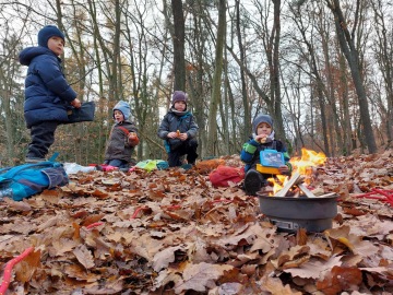 Podzim předává svou vládu zimě. Plynule, tiše, přirozeně. Ráno je frišno, v lese táhne, přibývá temna a šera, dny se krátí. Prší, skoro sněží. Z paprsků sluníčka máme radost. Měníme dress code, stávají se z nás cibule. Jedno triko, dvě trika, jedny rukavice, dvoje rukavice, troje rukavice. Kde mám rukavice? Putujeme lesem do kopců, abychom se zahřáli a posvačili v teple, ohýnkem v přenosném ohništi si pomáháme. Jak být s ohněm v bezpečí si ujasňujeme. Dobrý sluha, špatný pán.