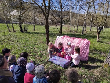 Naše pohádkové téma jsme začali povídáním o různých pohádkách které známe. Předváděli jsme různé pohádkové postavy, a došlo i na hraní pohádek s vymýšlením příběhů. Už víme, že pohádky mají začátek, příběh se zápletkou a konec. Na hraní jsme použili různé figurky a maňásky. Moc nás to bavilo.