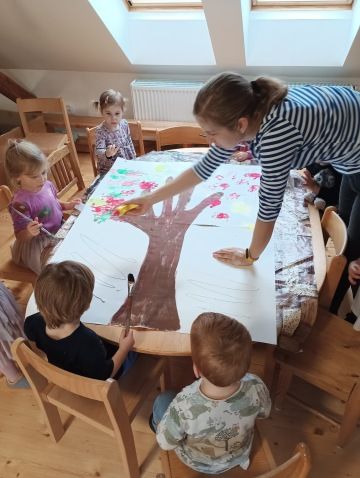 Jak to všechno v pár větách popsat? Minulý týden spadla v herně spousta listí a tak jsme ho tento týden ještě hezky spotřebovali a dodělávali náš velký strom. A taky se listy hodily do veliké krabice s barvou a kaštany a s ořechy a pak se vesele třepalo s bednou. Napsané to vypadá mnohem snadněji, než to ve skutečnosti bylo. Výsledné dílo můžete vidět na naší síti u schodů. A protože je krásný podzim a padají nám jablíčka, upekli jsme si štrůdl! A děti opravdu krájely a strouhaly, trochu. Měly jsme štrůdl ke svačině a překvapivě ho všechny děti jedly. A víte, jak si děti před jídlem myjí ruce? Ochotně a dlouho! Třeba rulička toaleťáku ucpe umyvadlo poměrně spolehlivě. Nebo se dá pustit jeden kohoutek za druhým a když se otočí všechny doprava, mimo umyvadlo, voda padá krásným vodopádem na podlahu :-))) Se Školkáčema jsme v herně hráli a zpívali s kytarou a Pájou a hráli na klavír. No, máme takový dojem, že jsme se moc nezastavili a bylo nám dobře. Těšíme se na další týden, nejspíš už začneme zpívat koledy!