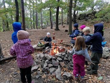 Lesem procházíme s napětím, stopujeme totiž draka! Rozuměj, objevili jsme kapky krve dračí...možná sluj...draka naštěstí ne. Pro odlehčení si cestou dáváme hádanky. První větší podzimní déšť nás na chvíli zahnal do jurtičky, ale i tam je čas příjemný. Stihneme si pohrát, s kaštany potrénovat naše předmatematické představy. Kde je více, kde je méně, počty, co se nám vejdou do dlaně i dlouhého hada přesně ze 114 kaštanů. Vyrobíme si létavice z látek, kaštanů a provázku. Chce to zručnost, sílu, práci s vrtačkou i jemný cit. Létají za námi poslušně a krásně. Házíme s nimi na cíl, někdo na strom. :-)