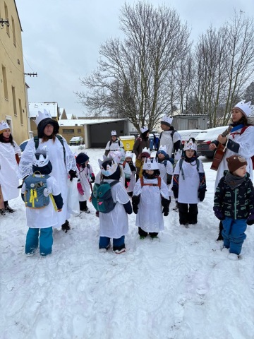 Týden zakončujeme tříkrálovým průvodem pro Charitu ČR, výtěžek bude použit u nás v regionu pro děti ze znevýhodněnych rodin. Bílá trička ladí k bílému čerstvě napadanému snížku. Korunky na hlavách září, a zpěvem potešíme všechny kdo nám otevřou dveře.