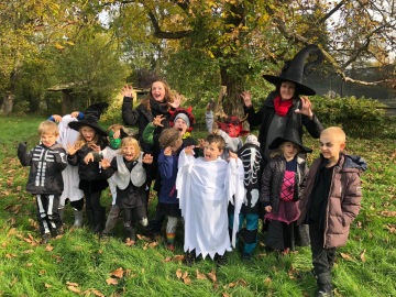 V anglickém jazyce Ledňáčci slavili Halloween. Každý Ledňáček představil svůj kostým. Společně s Puštíky si venku zahráli hry v týmech inspirované Halloweenem: pumpkin rolling, spider's eggs, ghosts, apple catching. Vyrobili si vlastního ghost nebo Jack-o'-lantern.