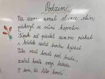 I k Vrabčákům přišel podzim. V pondělí jsme společně otevřeli krabici, která skrývala mnoho indicií, jež nás vedly k tématu pondělního vyučování – podzimní rovnodennost a změny okolo nás. Pracovali jsme s různými články na téma Jak podzimní změny ovlivňují přírodu, zvířata a nás lidi? - četli jsme, prezentovali a diskutovali. Pátek jsme věnovali pozornost státnímu svátku a životu svatého Václava – patrona české země. Ověřili jsme si znalosti českého jazyka i matematiky, když jsme počítali, kolik pytlů obilí dostala každá vesnice nebo kolik by bylo Václavovi, kdyby žil až do dnešního dne :) V matematice jsme se věnovali opakování a souřadnicím. V češtině jsme věnovali pozornost i poezii a vybrali z mnoha různých básniček jednu, kterou se společně naučíme na říjnové třídní kruhy. V anglickém jazyce si Vrabčáci přečetli krátký příběh, ve kterém se seznámili s novými zaměstnáními. Poslechli si písničku What a Wonderful World a doplnili chybějící slova v textu písně. Zopakovali si pokyny ve třídě při hledací hře a zahráli si bingo na procvičení čísel. A také jsme ztvárnili naše třídní pravidla – zkuste se zamyslet, k čemu odkazuje lama, želva, lamborghini, dva lvi, velbloud, spojka, roh jednorožce či hroší břicho? :)