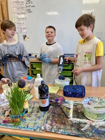 Závěr týdne jsme si zpestřili velikonočním tvořením – vznikla vesmírná vajíčka vytvořená pomocí akrylových barev. Pro rychlejší zasychání při vrstvení barev se naučili Vrabčáci využívat horkovzdušnou pistoli. Děti pracovaly s chutí a fantazií – výsledky tohoto experimentu jsou opravdu rozmanité.