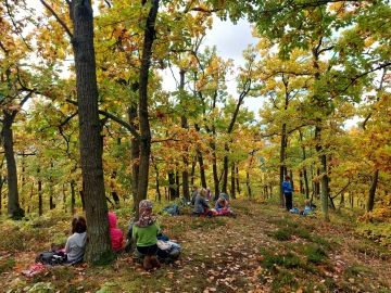 Žijeme okamžikem, rozhlížíme se kolem sebe, vnímáme podzim všemi smysly. Celodenně putujeme do nejvyšších černošických kopců za krásnými výhledy. Babka nám skýtá útočiště při svačině a volném hraní, kde se naše třída krásně propojuje a společnými silami vznikají parádní díla - mechové přístřešky, vydří nory, veverčí hnízda i oblečené pařezy. :-) Staňkovka nám zase při obědě nabízí krásný výhled do údolí. Cestou sbíráme ty nejzajímavější listy na tvoření a zdobení třídy, poznáváme brsleny, nacházíme duběnky, ve kterých bydlí žlabatky dubové a spoustu dalších pokladů a zajímavostí k prozkoumání. Je to pro nás obrovsky vzácný čas, kdy spolu můžeme jen tak být, povídat si, dýchat čerstvý podzimní vzduch a volně objevovat a tvořit.