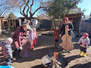 Vzduch voněl jarem, na ohni se vařila bramborová polévka, na kterou děti celé ráno krájely zeleninu :-), ale i ony měly radost, že obědváme na sluníčku venku. A v pátek nám Pruhované panenky zahrály O smolíčkovi. Bylo to fajné!