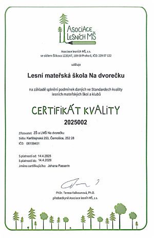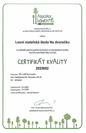 Certifikát říká, že u nás najdete bezpečné prostředí, ve kterém se děti mohou volně pohybovat, objevovat a růst. Že se tu o ně starají lidé, kterým na nich opravdu záleží, a kteří jim dávají prostor být samy sebou. A že příroda není jen kulisou, ale místem, kde se rodí radost, přátelství i důležité zkušenosti.