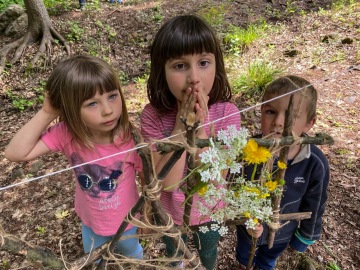 Mezi 9 a 12 hodinou už je program nabitý. Začínáme den ranním kruhem, po kterém následuje svačinka, kterou si děti nosí z domova. Ranní kruh i svačina mohou probíhat v areálu školky, nebo třeba rovnou v lese.