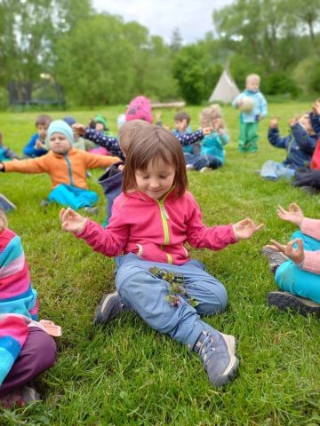 Děti se každé ráno dozví, co je ten den čeká a kdo se na ně těší. Mezi 9 a 12 hodinou už je program nabitý. Začínáme den zpravidla jednoduchým jógovým cvičením, pak následuje dobrá svačinka a komunitní kruh. V něm se věnujeme tématu, které nás právě provází.